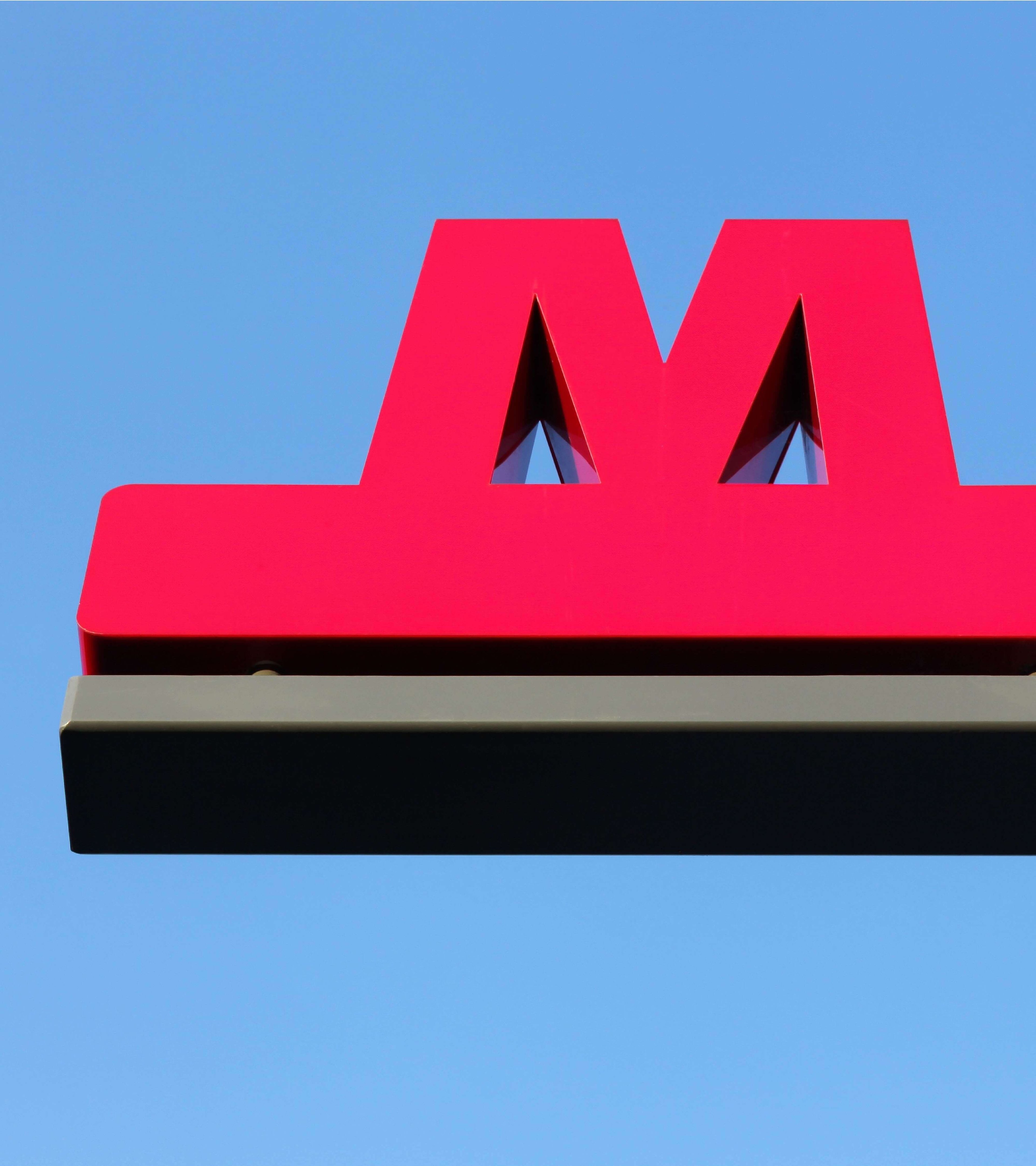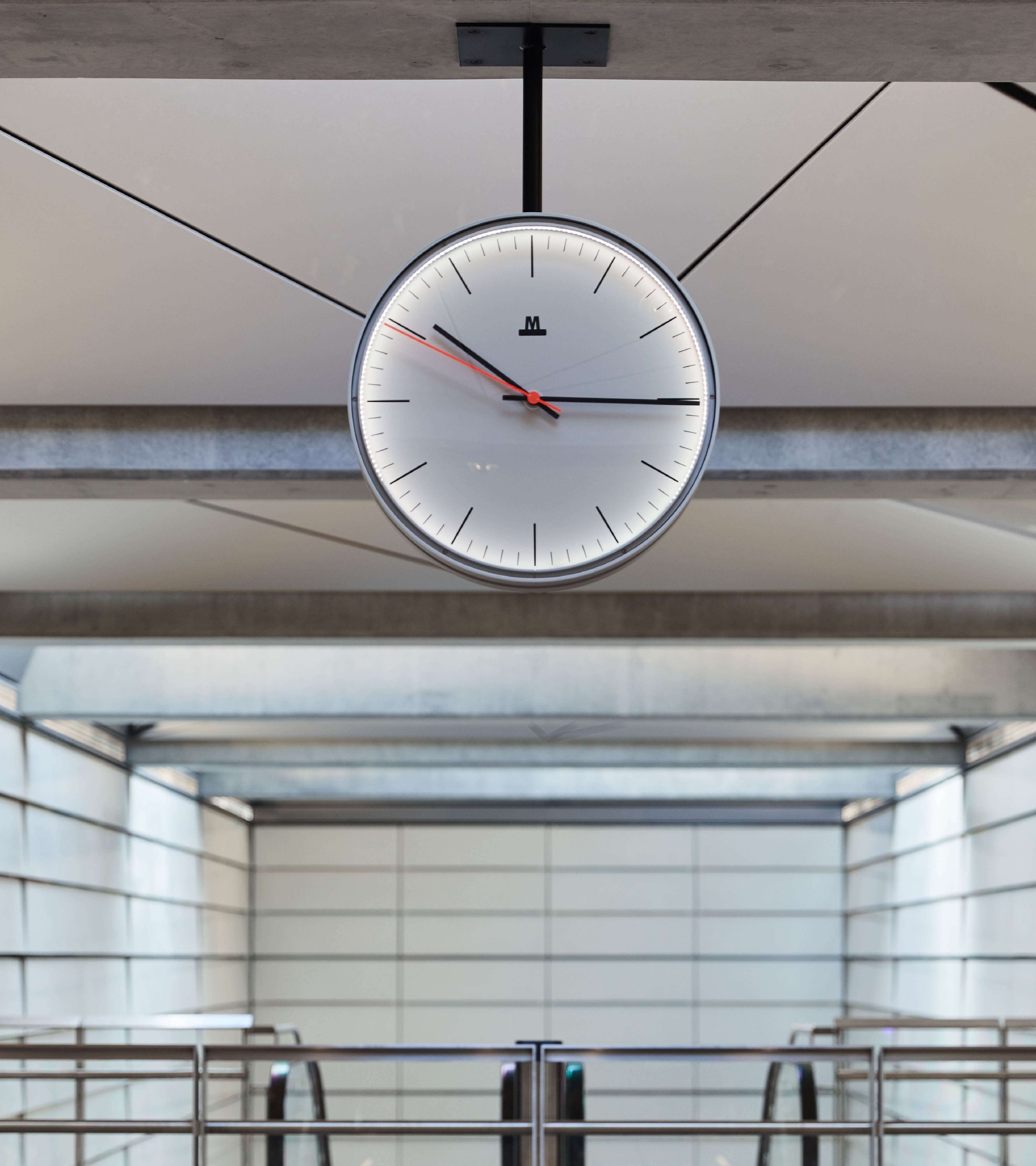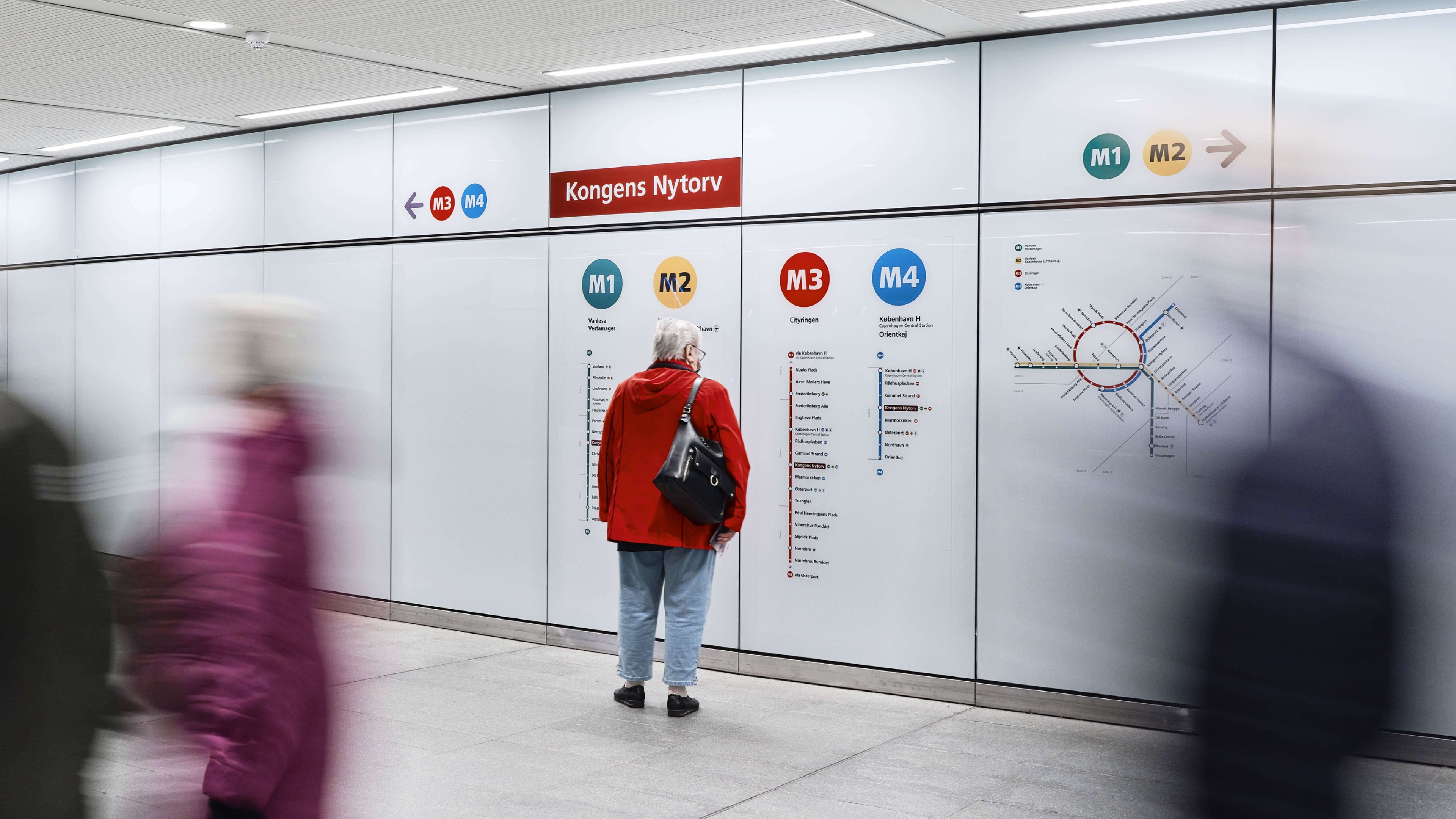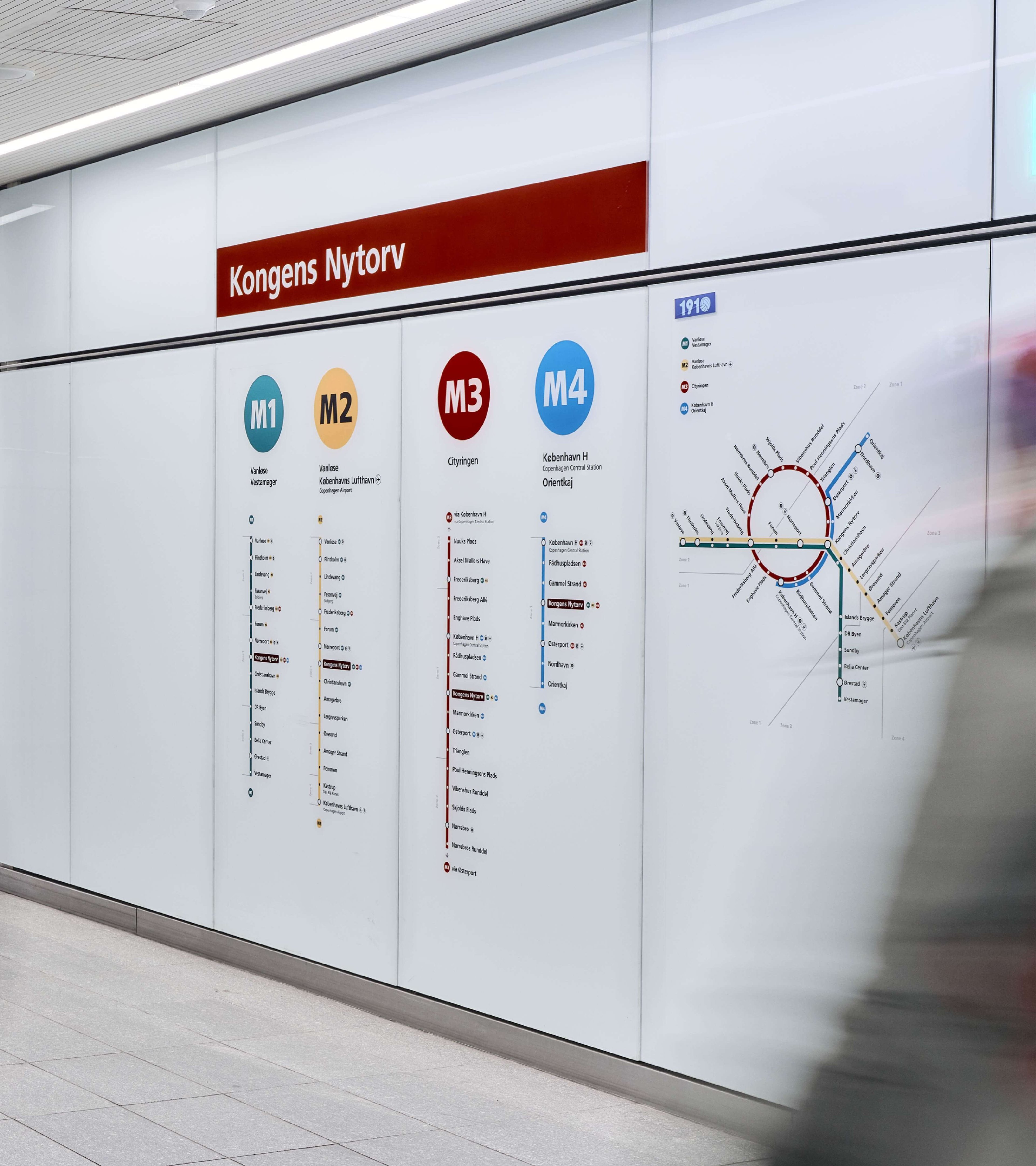 コペンハーゲン市の新たな環状地下鉄のサイン開発は、正確さとミニマリズム、そして寛大さを必要とするものでした。毎日何千人もの乗客が利用することを念頭に置いてデザインされた新しいサインは、街を探索するための開かれた招待状として、自信に満ちたものでなければならなかったのです。全体的なデザインは、Per Mollerupが過去に手がけたM1、M2線からインスピレーションを受け、既存のシステムとシームレスに統合され、コペンハーゲンメトロ全体の概要を分かりやすく伝えています。また、旅客案内システムのリニューアルは、色の定義の見直し、発車案内板の動きの連続性、読みやすいタイポグラフィー、ピクトグラム、すべての情報の厳密な構造化と編成を経て完成されました。