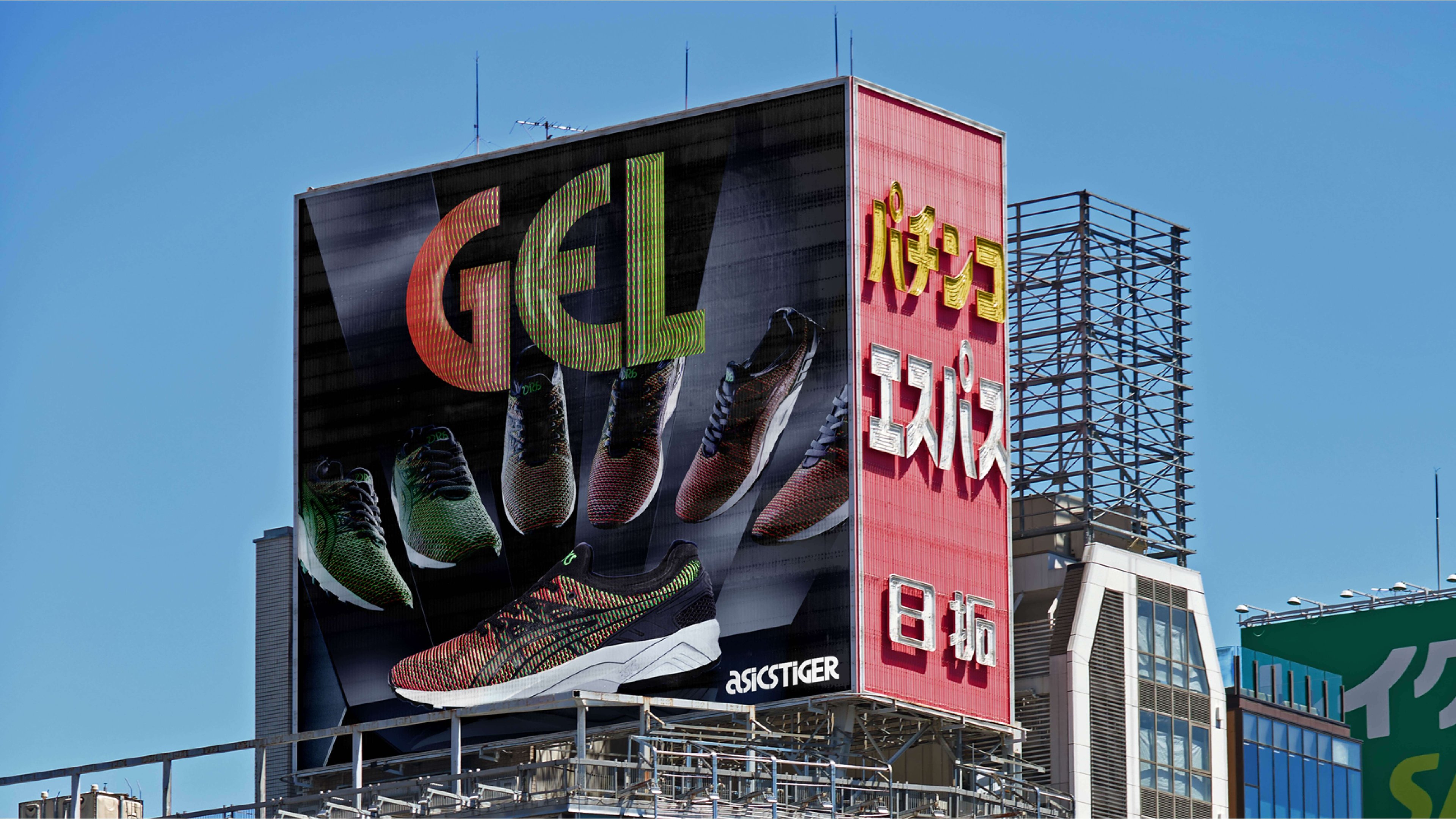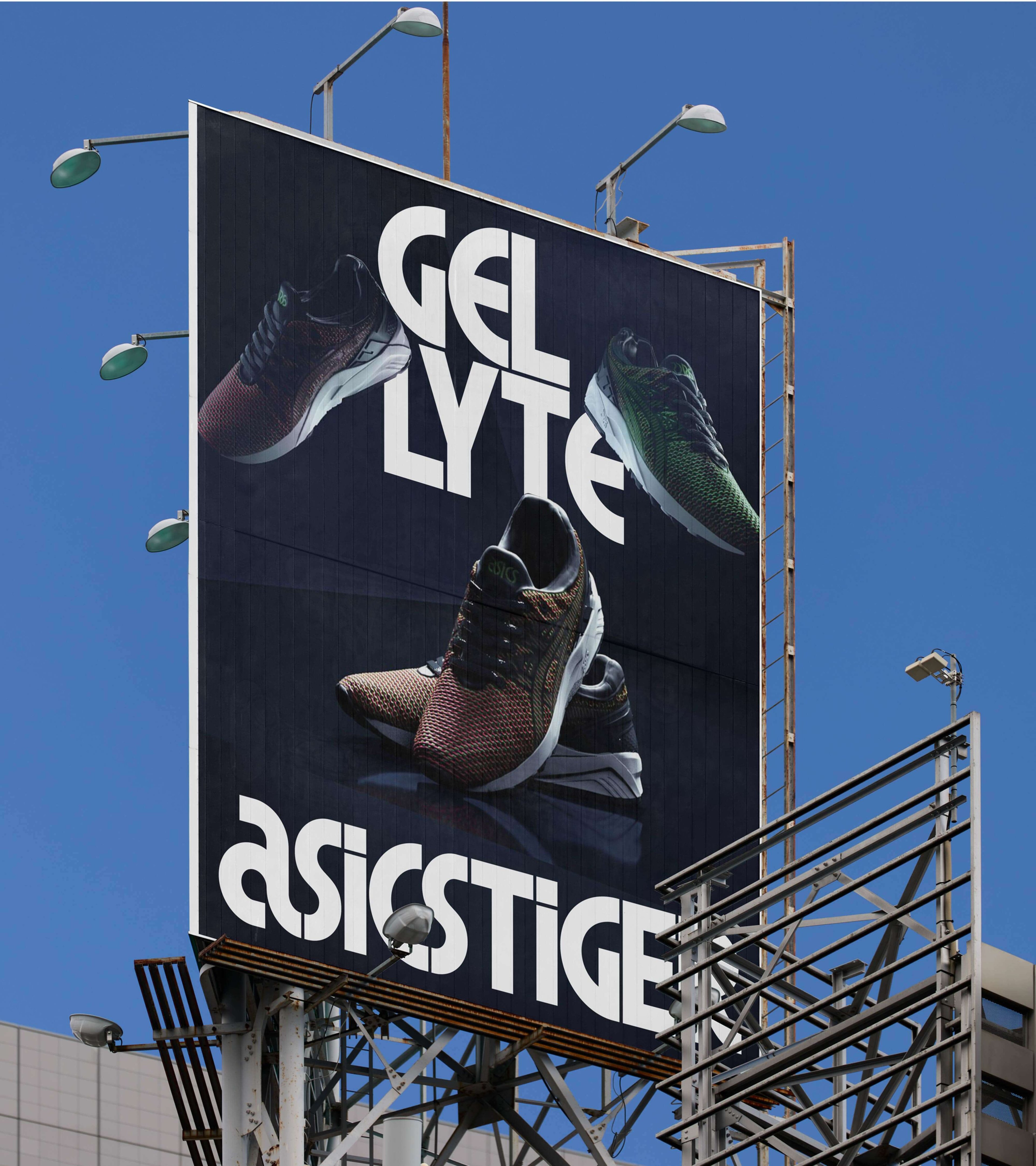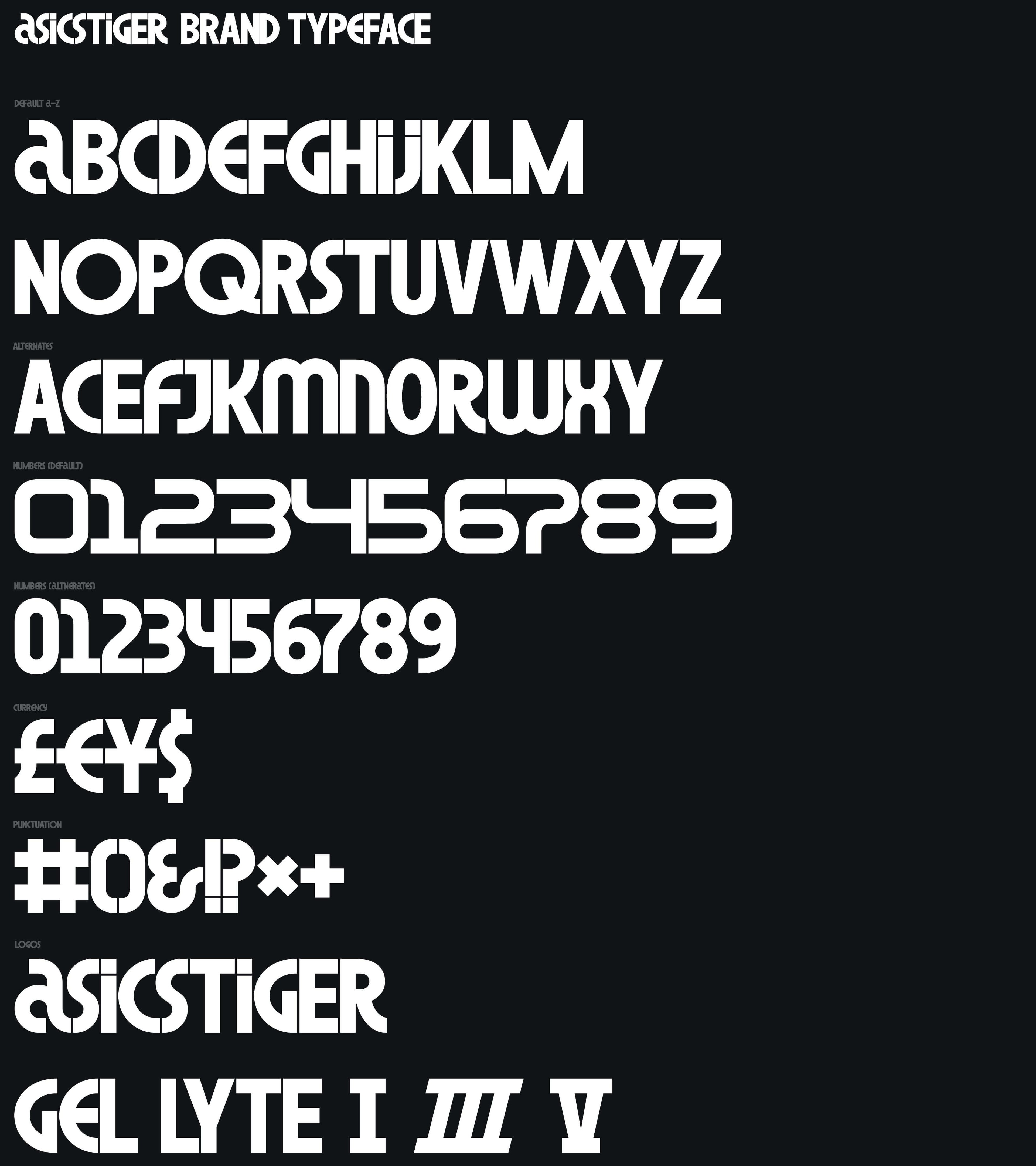 Kontrapunktは、LubalinとPeckolickが作り上げた独創的で象徴的なASICSのオリジナルロゴをもとに独自のタイポグラフィをデザインすることになりました。そして、Bruce Mau Designとのコラボレーションにより、大阪のフラッグシップストアのファサードから靴箱に入れるブランドリーフレットまで、世界中のディスプレイに使用できるASICS Tigerのユニークなブランドタイポグラフィをつくりあげたのです。この特別な書体は、スポーツブランドの象徴であるASICSのように、表現力豊かでエネルギッシュなものになりました。